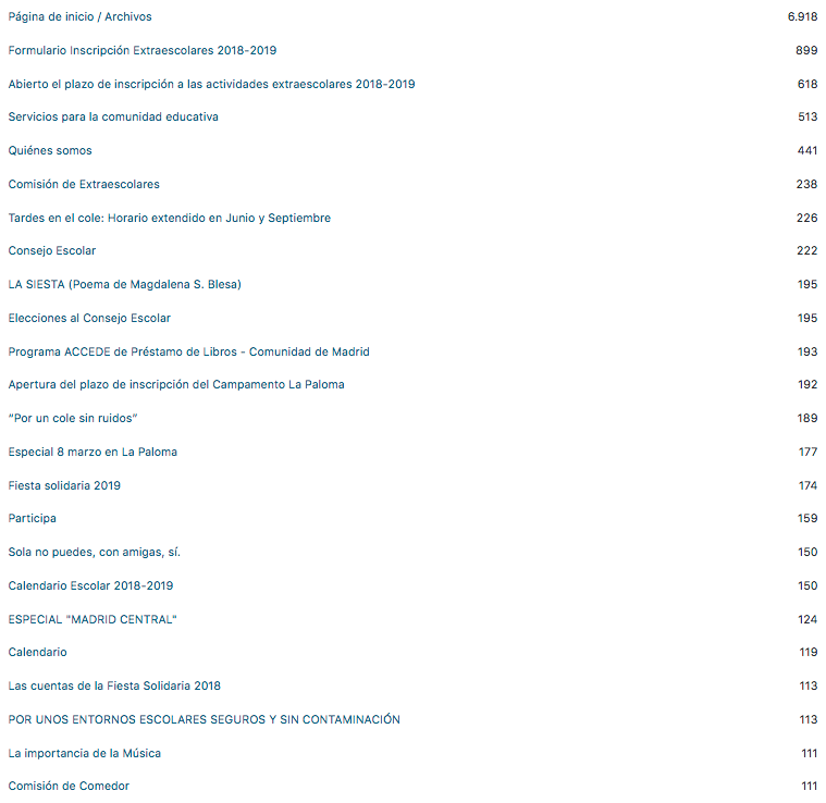 Mención especial el cambio que se ha hecho a la hora de apuntarse a las actividades extraescolares usando un formulario y el blog, en lugar de rellenar un papel a mano. De hecho esta ha sido la entrada más visitada de todo este curso con 823 visitas.