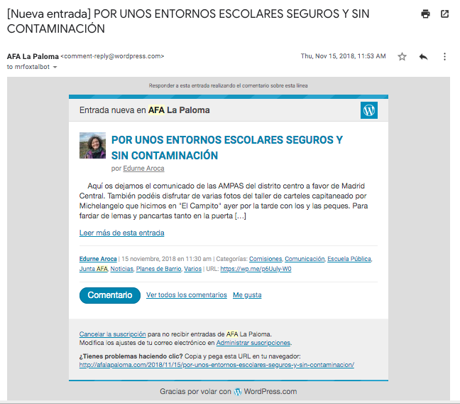 La web tiene 138 subscriptores (de 109 con los que terminamos el año pasado), que reciben un email como este de aquí abajo de manera automática cada vez que se publica una entrada: