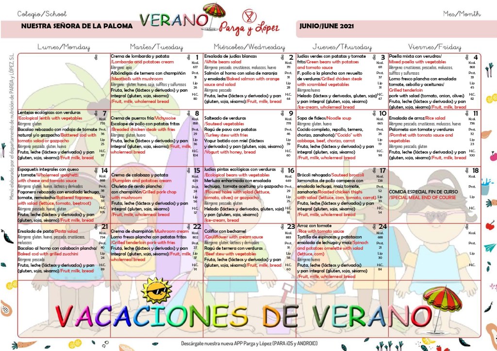 Os dejamos los menús del último mes del curso. Ya no queda nada para que nuestras criaturas disfruten de esas tan merecidas vacaciones y mientras, nada mejor que cargar pilas con nuestros menús ricos y equilibrados.