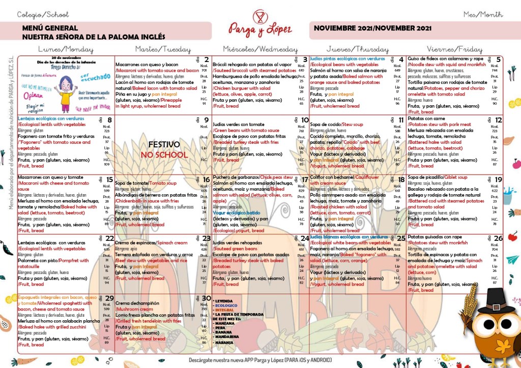 Familias palomeras, os dejamos los menús que la empresa de comedor pone a disposición de nuestras criaturas para este mes de noviembre.