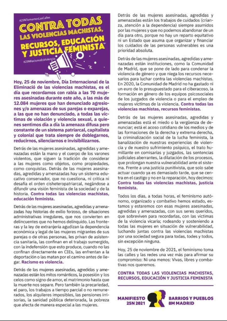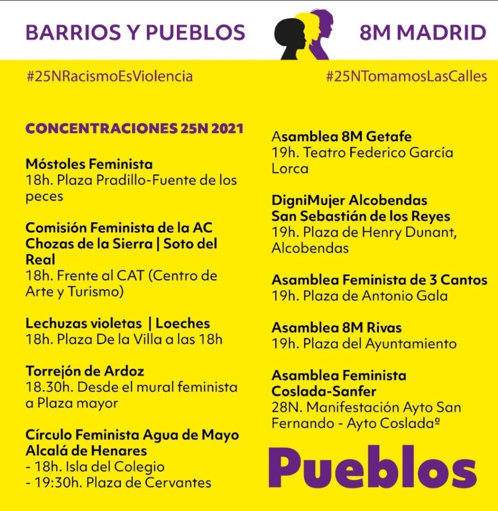 Os dejamos el manifiesto que se ha elaborado desde Feminismos Madrid y las diversas convocatorias de encuentros y concentraciones en barrios y pueblos por si os queréis sumar.