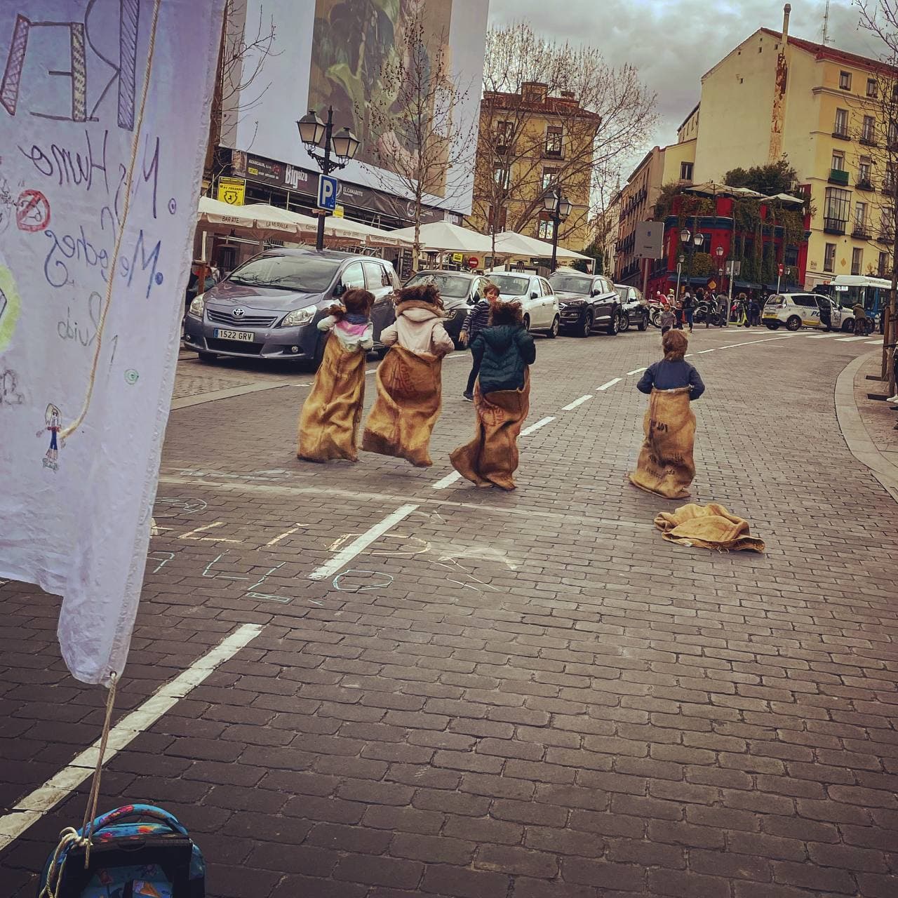 Una vez que la policía se aclaró e hizo efectivo el corte que habíamos convocado, los cada vez más diversos escenarios que componen la revuelta palomera comenzaron a brotar bajo un cielo negro que nos dio tregua hasta el final. La música sirvió de banda sonora festiva para acompañar a los niños y niñas que hicieron cola incansables a la espera de su turno para el pintacaras, actividad que se vio complementada en esta ocasión por el nuevo proyecto de repoblación de alcorques que se hará realidad en la revuelta del mes de abril: delante del puesto de la calle Tabernillas revoloteaban pequeñas manos que sostenían los envases de yogur en los que iban a plantar semillas con la ilusión de que dentro de un mes echen raíces y nos acompañen cada día en la entrada y salida del cole. Las carreras de sacos, los bailes, la comba o el fútbol contribuyeron también a que vayamos ocupando cada vez con menor timidez el espacio que aspiramos a recuperar: esperamos que en mayo sea más evidente cuando llevemos a la práctica la idea de la carrera solidaria y sustituyamos coches y carretera por atletas y pista de atletismo.