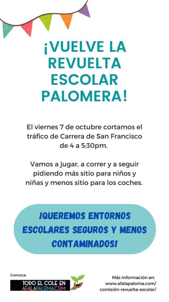 📢¡Familias palomeras!📢 ¡¡Empezamos el curso con nueva convocatoria de #RevueltaEscolar!! ☺️Este viernes 7 de octubre se CORTARÁ EL TRÁFICO de la calle Tabernillas y Carrera de San Francisco entre tenemos […]