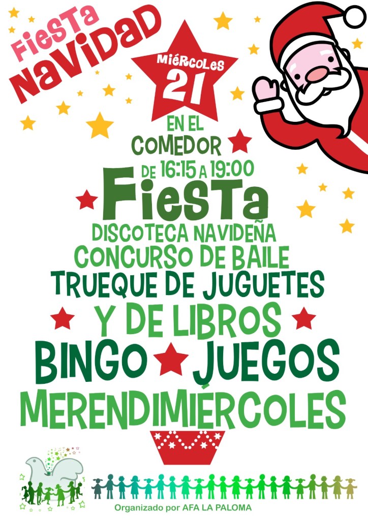 Familias palomeras, pero qué alegrón nos da contaros que el miércoles que viene, día 21 de diciembre, retomamos nuestra FIESTA DE NAVIDAD después de un parón de 2 cursos, ¡yupi!.