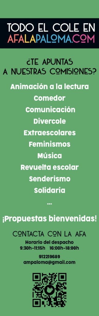 Y ya aprovechamos el mensaje para lanzaros la convocatoria de la 1ª asamblea de socias y socios de la AFA del curso 23-24 que tendrá lugar el martes 7 de noviembre a las 17:00 h en la biblioteca del cole. Estáis invitadas todas las familias, aunque todavía no seáis socias 😉