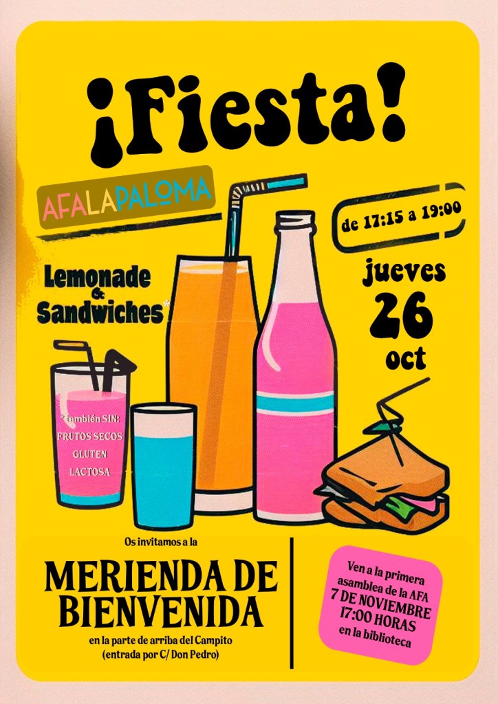 Os esperamos el próximo jueves 26 desde las 17:15 y hasta las 19:00 h en la parque de arriba del » Campito» (entrada por c/ Don Pedro) . Podremos disfrutar de un piscolabis (también apto para personas alérgicas) y de alguna que otra sorpresilla gracias a la colaboración de varias familias del cole.