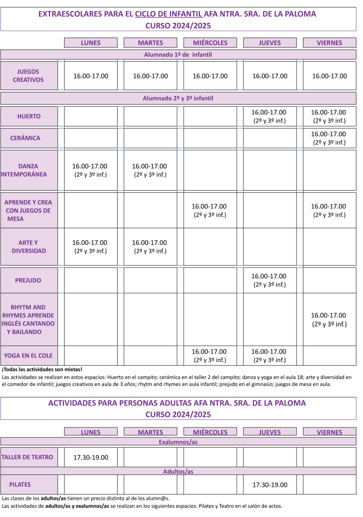 Desde la AFA se oferta : Primeros del cole (durante todo el curso, entre las 07.30 h y las 09.00 h), Tardes en el cole (en junio y septiembre, hasta las 17.00 h) y las Actividades Extraescolares (para las cuales adjuntamos el calendario semanal que tenemos previsto realizar). En estas actividades los grupos serán de un mínimo de 10 niños y niñas para que la actividad pueda ser viable y todas las actividades propuestas (fútbol, baloncesto, danza, judo, etc.) son mixtas.