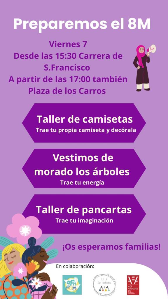Y el viernes 7 a la salida del cole y en colaboración con las Comisiones Feministas del CEIP Vázquez de Mella y del CEIP San Ildefonso se ha preparado toda una tarde reivindicativa y festiva entorno al 8 m. Tenemos permiso para cortar la Carrera de San Francisco y podremos disfrutar de un espacio pacificado y «decorado» con alguna sorpresa para el disfrute de nuestras criaturas: pintatizas feminista, chapas, música y varios talleres de camisetas y pancartas.