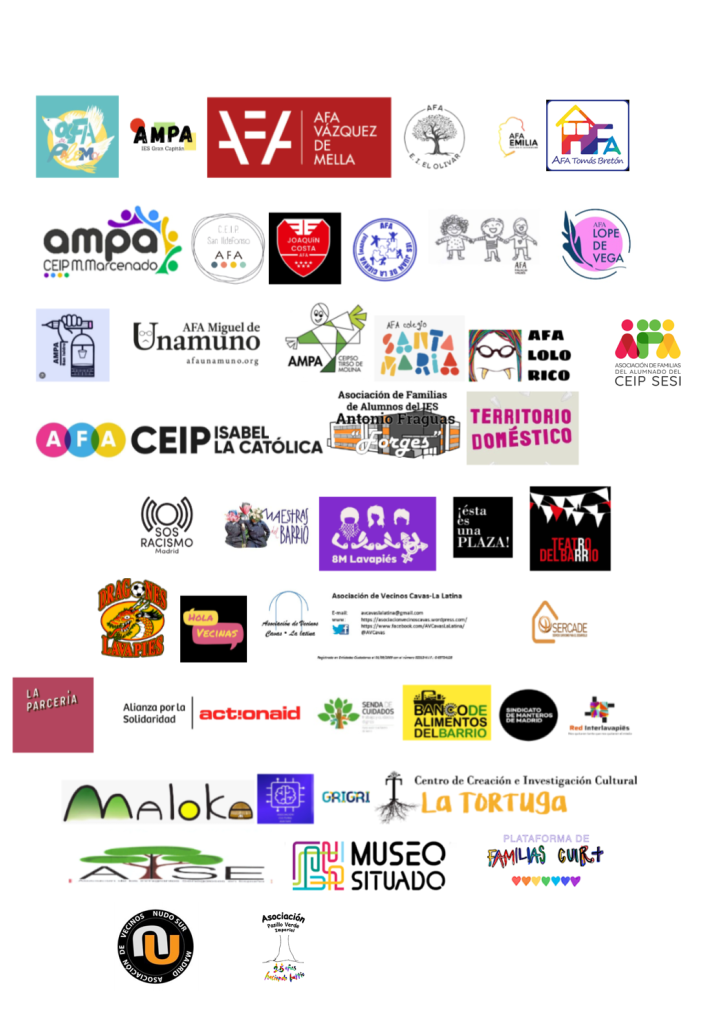 AFA EI El Olivar, AFA Miguel de Unamuno, AFA CEIP Emilia Pardo Bazán, AFA IES Juan de la Cierva, AFA CEIP Nuestra Señora de la Paloma, AFA CEIP San Ildefonso, AFA IES San Isidro, AMPA IES Gran Capitán, AMPA CEIP Marqúes de Marcenado, AFA CEIP SESI, AFA IES Antonio Fraguas ‘Forges’,AFA CEIP Tomás Bretón, AFA CEIP Palacio Valdés, AFA CEIP Vázquez de Mella, AFA CEIP Santa María, AFA CEIP Tirso de Molina, AFA EI Lolo Rico-Bruja Avería, AFA CEIP Lope de Vega, AFA CEIP Joaquín Costa, AFA CEIP Isabel La Católica, CDE Dragones de Lavapiés, Colectivo Territorio Doméstico, Asociación de Vecinos Cavas-La Latina, Comisión 8M Lavapiés, Asociación Maestras del Barrio, SOS Racismo Madrid, Esta es una plaza, SERCADE Servicio Capuchino Para el Desarrollo, Teatro del Barrio, Colectivo La Parcería, Actionaid Alianza por la Solidaridad, Grigri Projetcs, Asociación Vecinal Hola Vecinas, Escuela Senda de Cuidados, Maloka Asociación Brasileira, Asociación Cultural Avatars, Colectivo Banco de Alimentos del Barrio (BAB Colectivo), Red Interlavapiés, Aise Asociación de los Inmigrantes Senegaleses en España, Sindicato de Manteros de Madrid, CCIC La Tortuga, Espacio El Almendro, Plataforma de Familias Cuir, Asociación de Vecinos Nudo Sur, Asociación Vecinal Pasillo Verde Imperial.