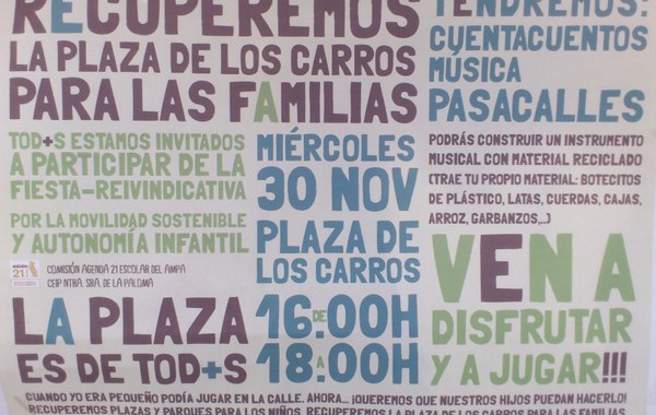 El grupo de niñ*s de las clases de percusión del Colegio La Paloma toca en la fiesta que reivindica el espacio de la la Plaza de los Carros para las familias, por la movilidad sostenible y la autonomía infantil.